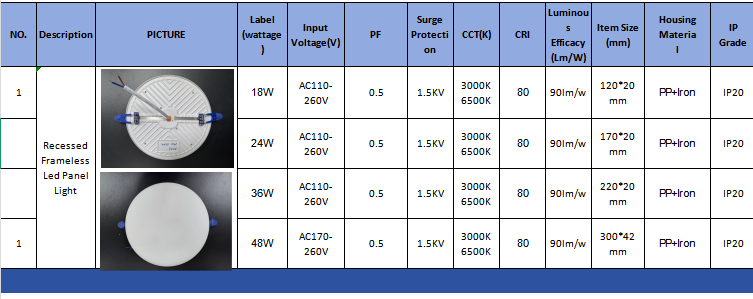 9/24/36W రీసెస్డ్ ఫ్రేమ్లెస్ DOB ప్యానెల్ లైట్, ఐరన్+పీపీ